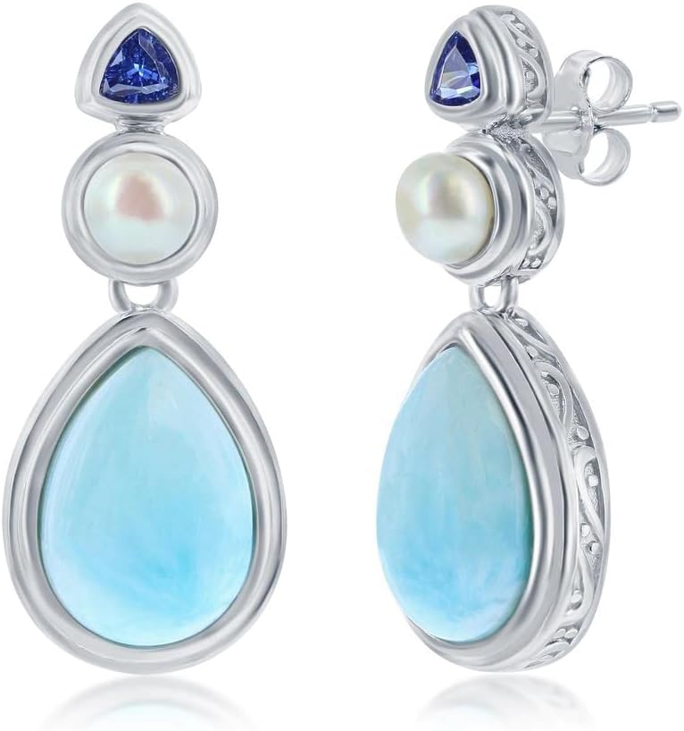 Amplify your look with this timeless design Sterling Silver triple shaped dangling earrings. This pair of earrings is well crafted and has a beautiful filigree border design giving you a rich and luxurious feel. It contains a triangle created tanzanite, and freshwater pearl with bigger pear-shaped Natural Larimar Gemstone to add gorgeous touch to the earrings. Made of 925 sterling silver, rhodium plated, and hypoallergenic for sensitive skin. Larimar is considered a healing stone and said to be finely tuned to the human body. Freshwater pearl is believed to offer protection, as well as attract good luck and wealth and the Tanzanite have the power to transform negative thoughts and energies into positive ones - symbolic gemstones put together as one powerful earring that will make a lovely addition to your jewelry collection.