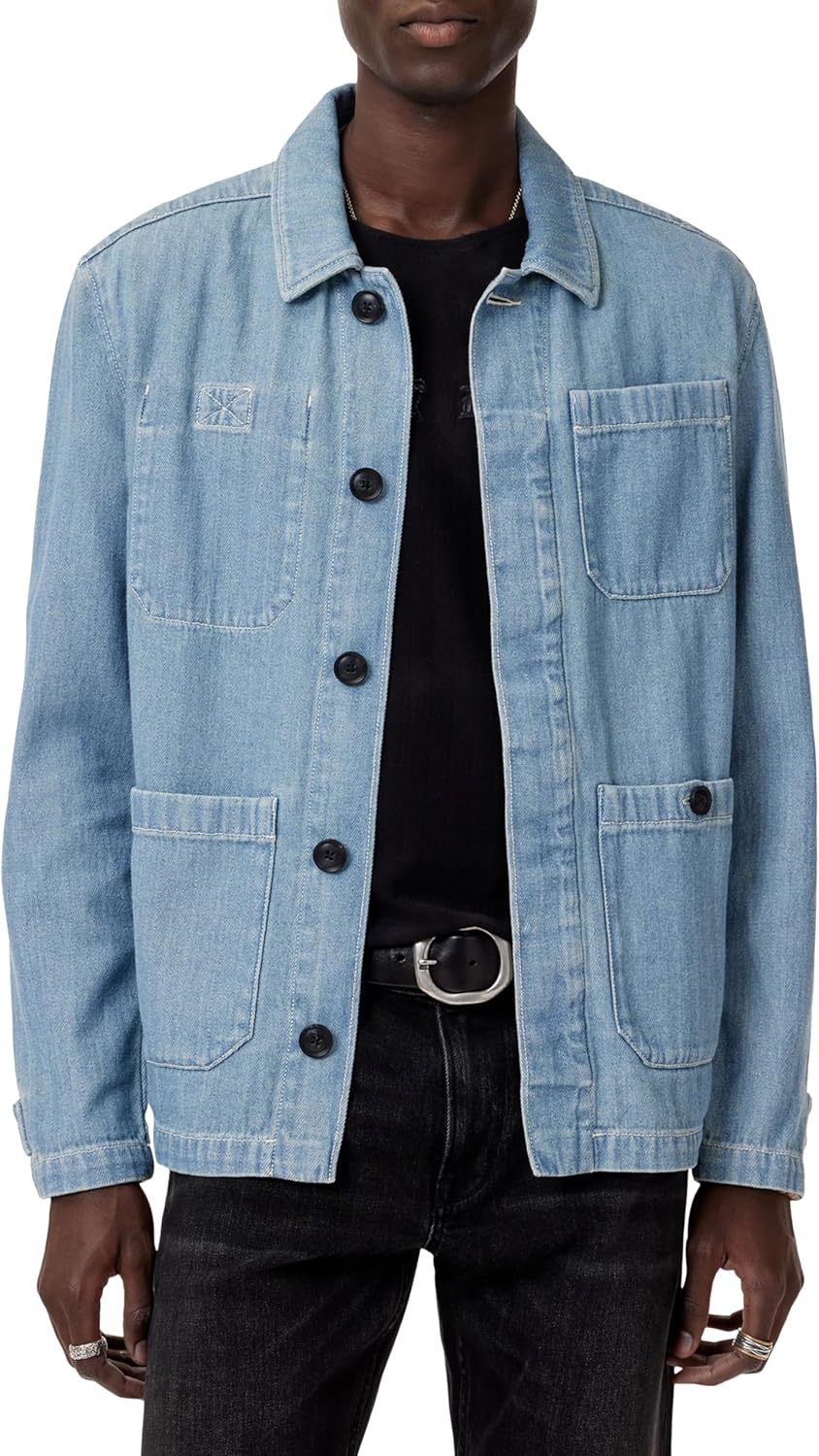 Heavy-washed herringbone denim with a lightweight touch. The Jakob Chore Jacket features a soft, broken-in feel, enhanced by subtle tonal embroidery of a snake and rose. Its over-dyed texture, hidden button placket, and interior pocket.