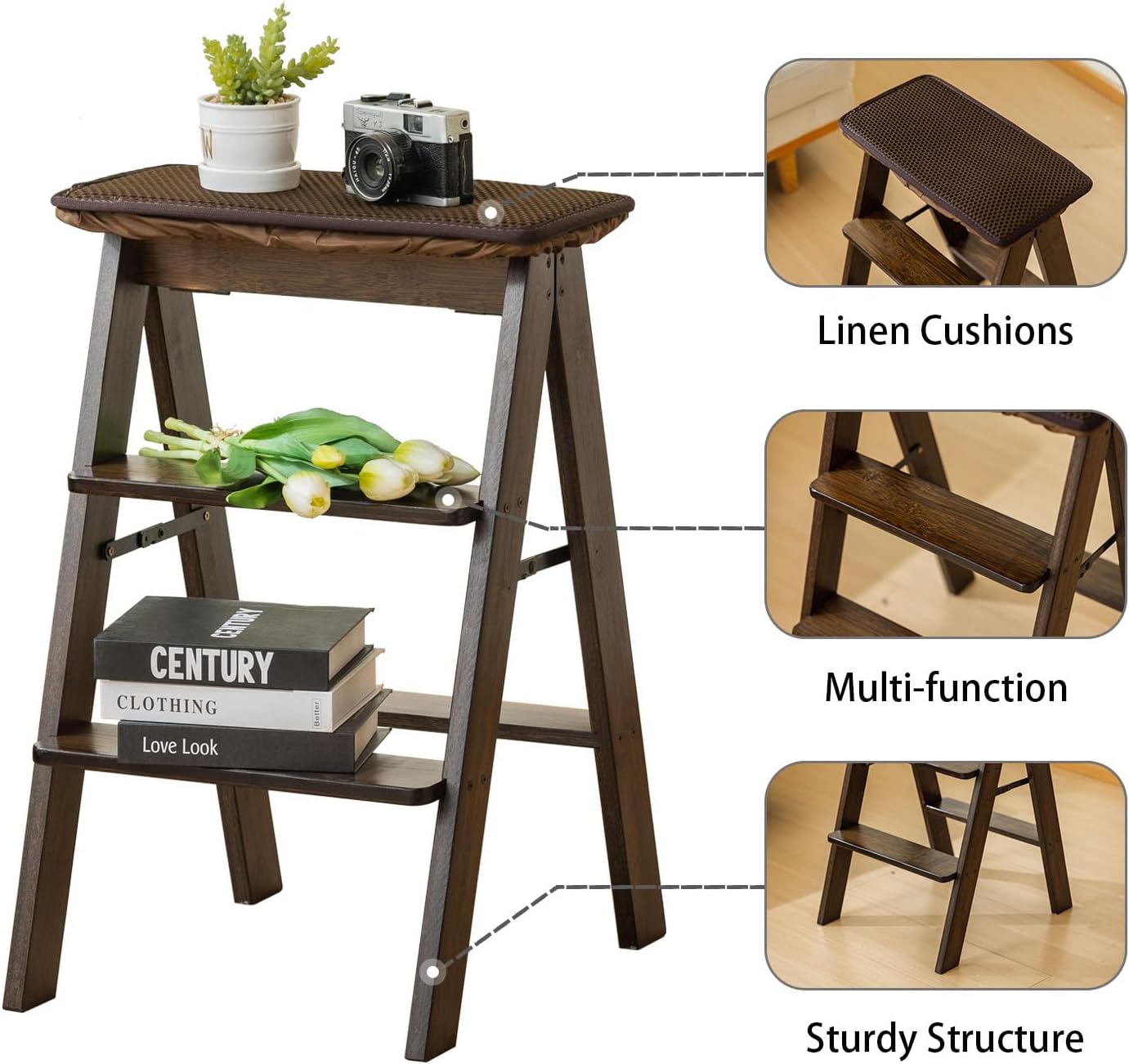 Latifolia Foldable 3 Step Ladder, Bamboo Step Stool with Floor Saver, Decorative Ladder Shelf for Living Room, Kitchen, Garden(Dark Walnut)