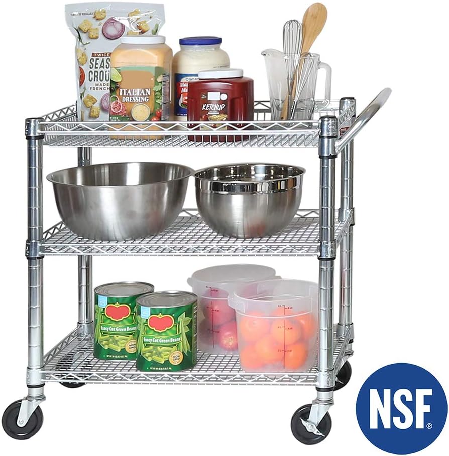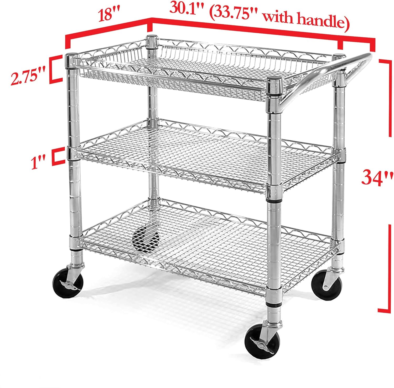Transport your things quickly and easily with Seville Classic’s 3-Tier Commercial Utility Cart. Choose the right cart for you home, kitchen, stockroom, or warehouse. Cart includes three tiers of storage, each height-adjustable at 1-inch increments. A large rounded steel handle provides easy control when empty or full. The unit consturucted of industrial-strength steel and protected with UltraZinc plating for defense against corrossion in dry environments. Designed for professional use, the cart is NSF certified for use in dry environments. It has a weight limit of 500 lbs. evenly distributed between shleves. Includes four swivel wheels, 2 locking. Cart measures 34 inches wide by 18 inches deep and 33.5 inches high when fully assembled. No tools required for assembly.UltraZinc plating provides necessary corrosion resistance in dry environmentsHandle bar allows for easy while maneuvering Industrial-strength steel wire construction for multipurpose useNSF certified for commercial, residential and office spacesEach shelf holds up to 150 lbs. in systems on leveling feet Wheels (4-inch diameter) allow for easy positioning Shelves are height adjustable by 1-inch increments; no tools requiredLimited 10-year warrantySpecifications Dimensions: 18"" D x 34"" W x 33.5"" H Dimensions (w/o handle bar & wheels): 18"" D x 30"" W x 32"" H Weight Capacity: 500 lbs. Weight: 42 lbs. Model #: SHE18304BZLimited 10-Year Warranty Seville Classics shelving is backed by a 10-year limited warranty unless otherwise specified. The warranty protects against original defects in material or workmanship under normal home or office use for the duration of the warranty period.