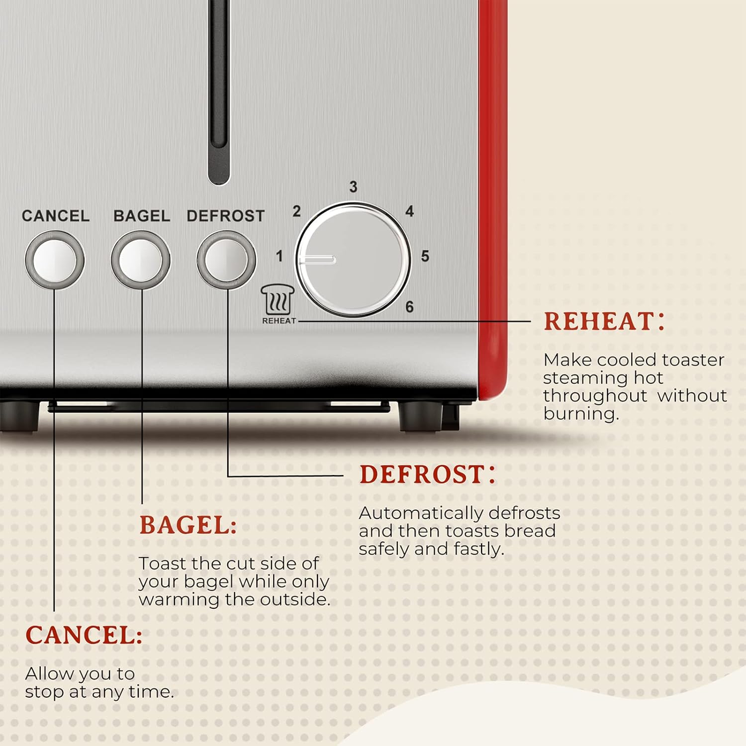 YIOU Toaster 2 Slice, the modern stainless steel toaster can be a better bread toaster for you. The stylish red toaster has 4 founctions of reheat, defrost, cancel and bagel, makes it a bagel toaster for those bagel-fav people, the 2 slice toaster is compact enough for those people who like compact toaster, even can be as a mini toaster and small toaster. With its excellent evenlly toast ability, it can be toaster the best 2 slice. Toaster 2 slice wide slot will fits various kinds of bigger bread like waffle and whole wheat bread